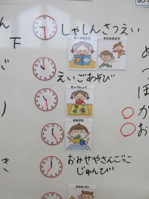 年長児は、小学校での時間割を想定して、毎日、1日のスケジュールを時刻と共に確認してからスタートしています。