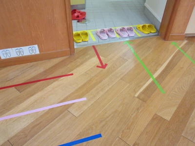 年中児になるために、トイレの使い方をさらに上手に練習しています。ぬいだズックはわきに揃えます。トイレに入るときは矢印のとおりに入る友だちと出てくる友だちがぶつからないようにします。トイレのサンダルは次の人のために揃えます。