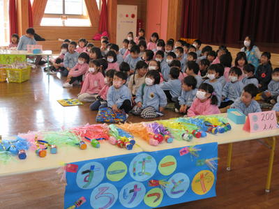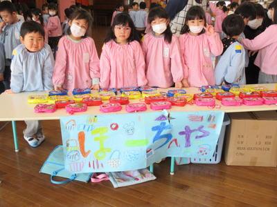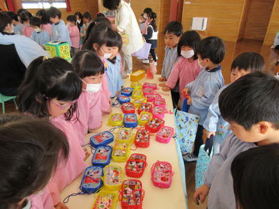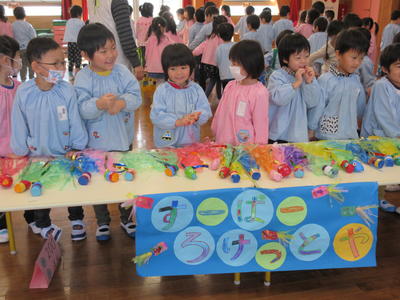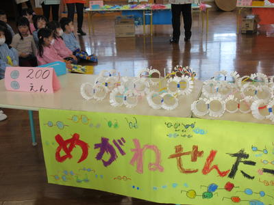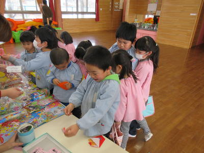 年中児と年長児は、年長児が手づくりした百円玉で買い物をしました。