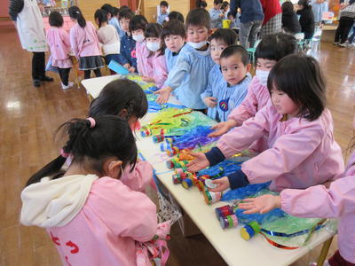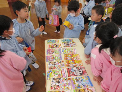 最初に年少児が買い物をしました。その後で、年長児と年中児が交代で買い物をしました。