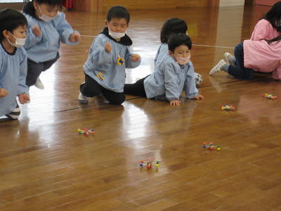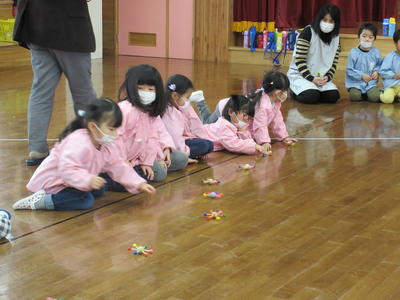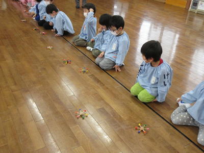 最初は、年少児が「スターこま」を回しました。星形のこまにそれぞれが色を付けたので、とてもきれいに回りました。