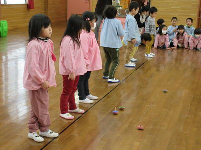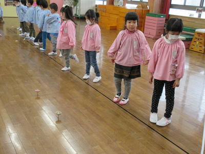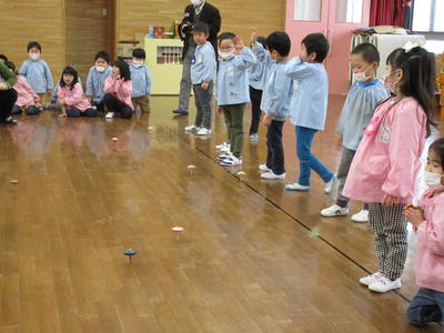 今日は、待ちに待ったこま回し大会でした。この日に向けて、子どもたちは冬休み中からお家でも幼稚園でも練習してきました。