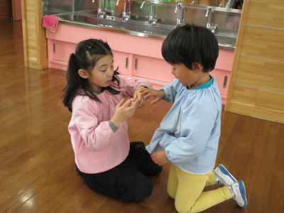 大会が終わってから、来年に向けて、年長児が年中児にひもこま回しの技を教えました。
