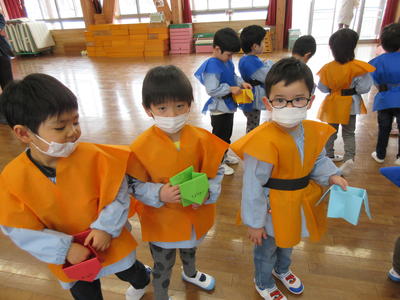 子どもたちは、一人ひとり追い出したい鬼を考えたり、鬼のお面や三方、かみしもをつくったりして準備をしてきました。