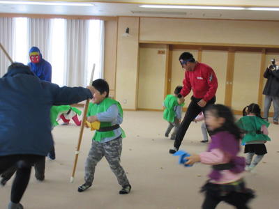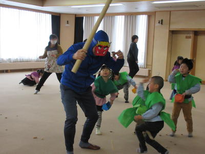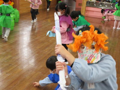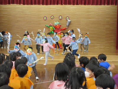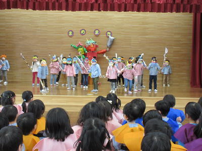 お遊戯室に年少児と年中児が集まったところに、ステージの幕が開き、年長児の鬼が飛び出してきました。