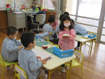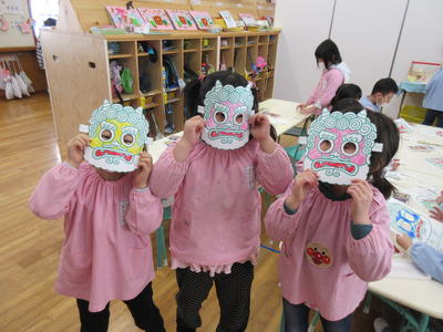 年長児は、2月1日の豆まきに向けて鬼の面づくりをしています。