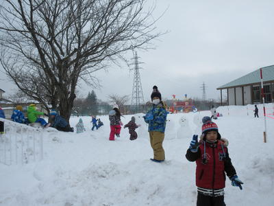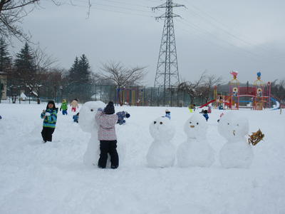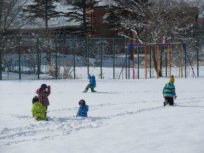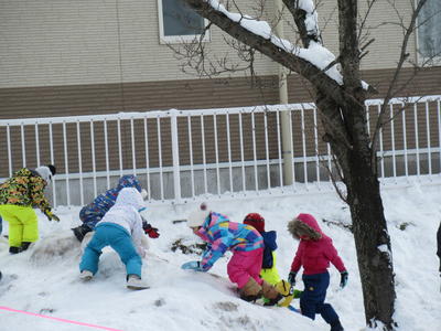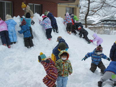 年長児と年中児は、園庭で深い雪を漕ぎながらどこまでも歩いてみたり、雪の滑り台を楽しんだり、昨日作った雪ダルマに目をつけたりしました。