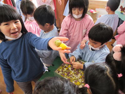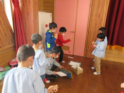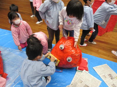 年中児は、同じく豆まきに向けて遊戯室で大きな鬼づくりをしています。怖い鬼になるようにと目玉が動くように工夫しました。