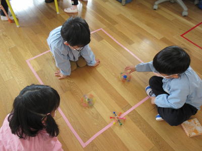 年少児は、来週のこま回し大会に向けて練習を始めました。