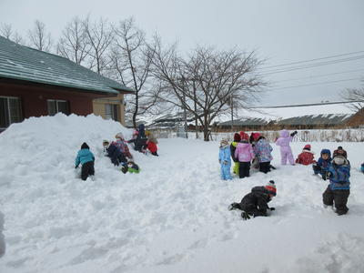今日は、絶好の雪遊び日和です。園舎の屋根の雪もすべて落ちて安全が確認できたので、雪遊びを満喫しました。