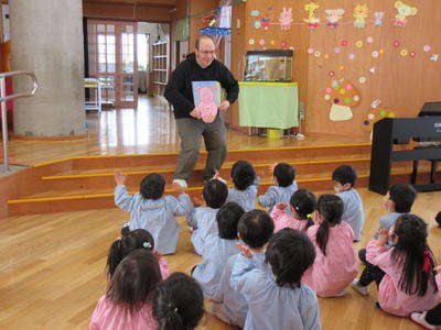 年少児も3学期から、ダン先生に英語の絵本の読み聞かせをしてもらっています。