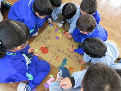 第一小からは、すごろく、縄跳び、読み聞かせ、あやとり、折り紙、お絵かきを教えてもらいました。
