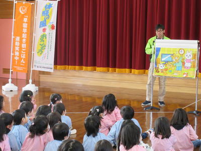 最初に紙芝居を見て、夜ふかしや朝寝坊をしないこと、朝ご飯をしっかり食べることなどを学びました。