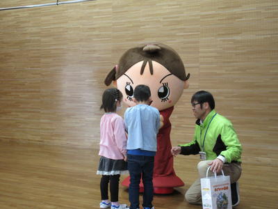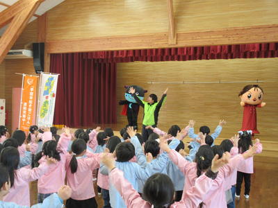それから、約束したことをダンスで表現しました。着ぐるみの「はやねちゃん」と「夜ふかしおに」も登場して、子どもたちは楽しみながら、「早寝早起き朝ごはん」を誓いました。