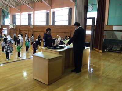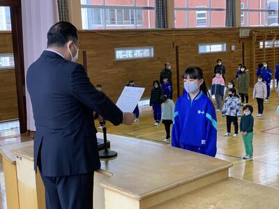 はじめに、今年度の『家庭の日』絵画作品部門で最優秀賞を受賞した児童の表彰を行いました