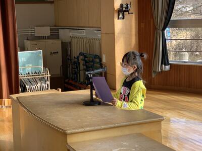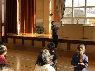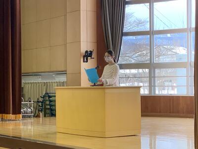2学期を振り返って、1年生代表児童が立派な発表を行いました
