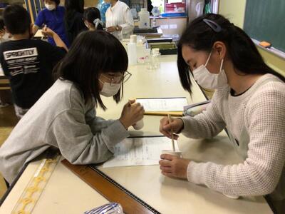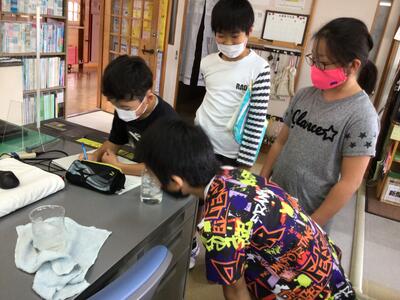 4年生の理科で、水蒸気の実験をしています校舎内のいろいろな場所にビーカーを置き、水蒸気がどれくらいついたか調べています