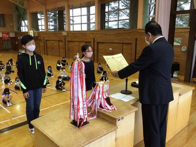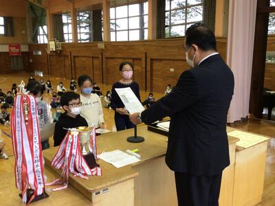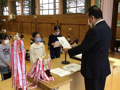 表彰された子どもたちはみんなの前で堂々と返事をしていました