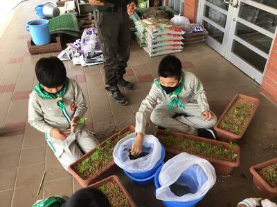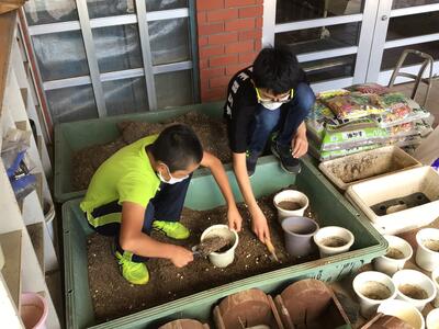 今日は緑の少年団が呼びかけ、ボランティアによる鉢に植えかえ作業を行いました根をはったアジサイは、これでゆったり1本ずつ育つことができます