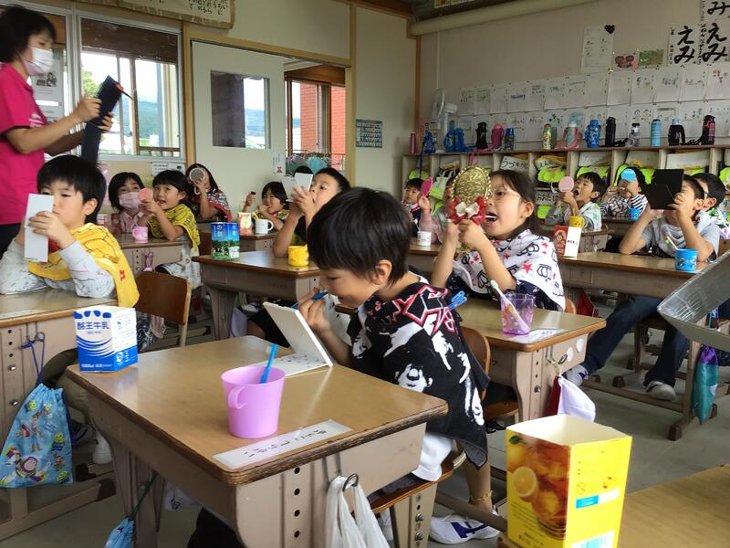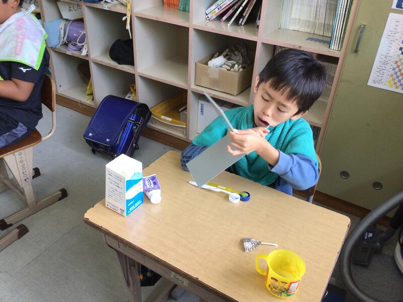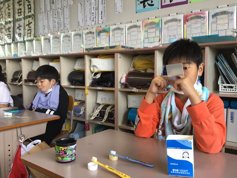 歯科衛生士さんのご指導のもと、口の中をかがみでのぞき、食べかすなどによる、みがき残しをチェックし、実際に歯ブラシを動かしながら正しい歯みがきの仕方について勉強することができました