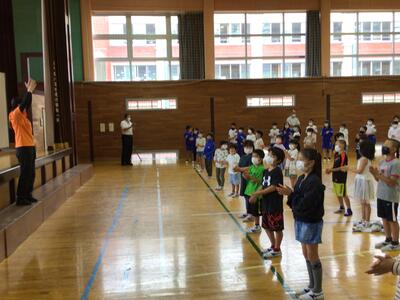 今日は全校朝の会、いつも通り元気なあいさつから始まりました