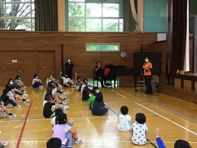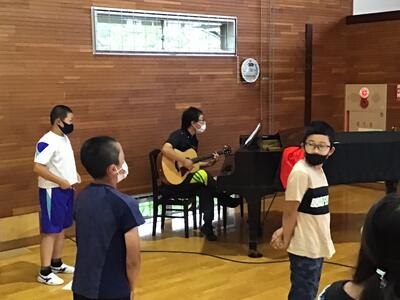 全校音楽ということで、今月の歌で、朝の会に歌ってきた「気球にのってどこまでも」を全校生で歌いました