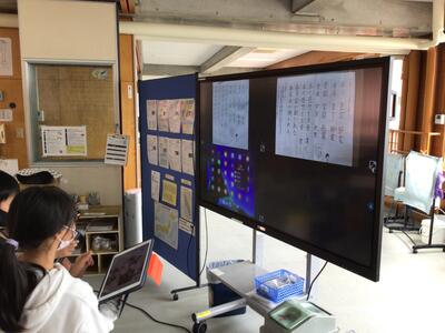 本校の充実したネット環境と、優れた電子黒板とタブレットの機能を生かして、「ミラーリング」をし、最大4人までの作品を写すことができます