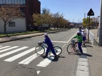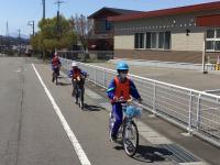 内容は学年ごとに分かれており、1,2年生は徒歩で横断歩道の渡り方や、近隣の危険箇所を先生方と一緒に確認しました。3,4年生は校庭で安全な自転車の乗り方を指導していただき、5,6年生は実際に自転車で校外に出て道路の渡り方などを確認しました。