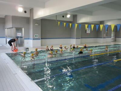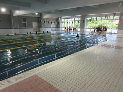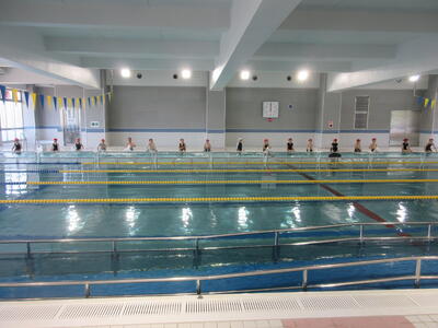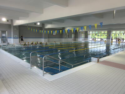 磐梯町ふれあいセンターの屋内温水プールで練習しています。