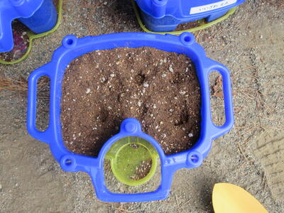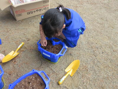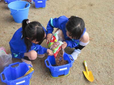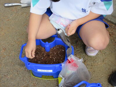 用務員さんが準備してくれた土を、丁寧に鉢に入れて、ミニトマトの苗を植えました。
