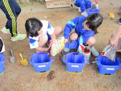 土を入れるのはちょっと大変だったので、友達と協力してやりました。