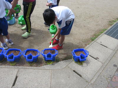 土から顔を出した小さな葉っぱを見て1年生は大喜び。