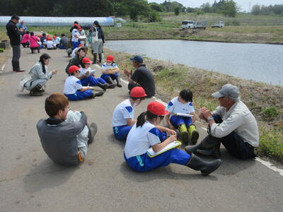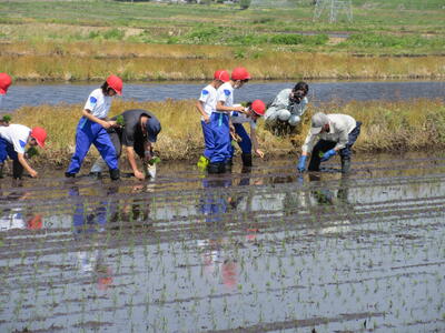 環境にやさしい農業(環境保全型農業)について説明を聞いた後、実際に田植え機に乗ってみたり、苗の手植えを行ってみたりしました。