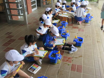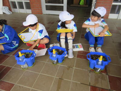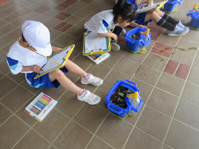 2年教室をのぞくと、先日植えたミニトマトの観察カードをかいていました。