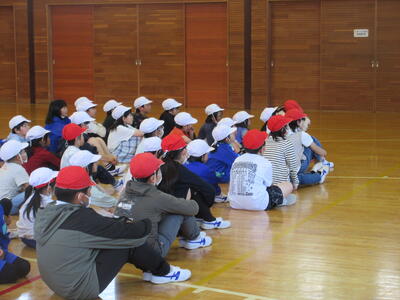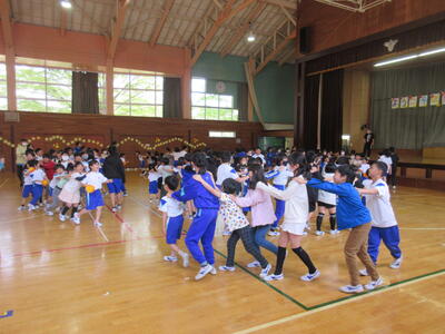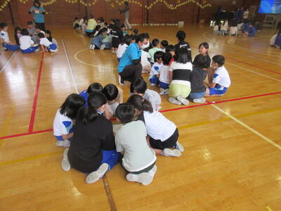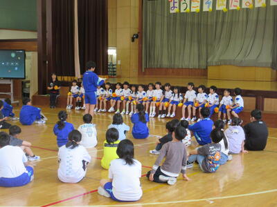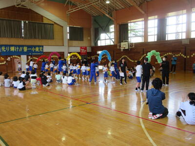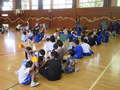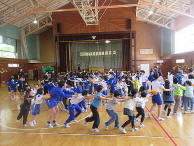 児童代表あいさつの後、縦割り班対抗のゲームを行いました。