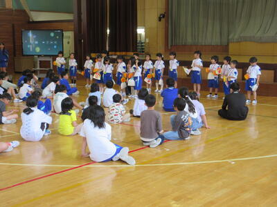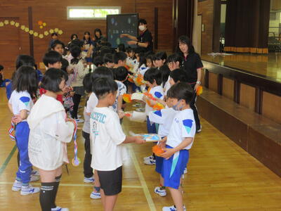 ゲームの後には、2年生と3年生から、1年生へプレゼントが渡されました。