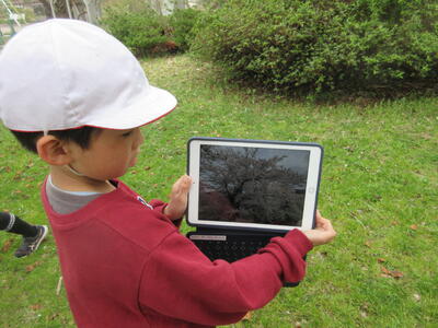 思い思いに自分の見つけた春の植物や動物を、写真(タブレット)で記録しました。