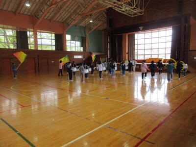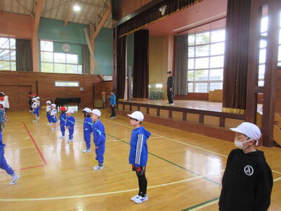 今日は「体操隊形の広がり方や列の整え方」「ラジオ体操」「回れ右」の練習をしました。