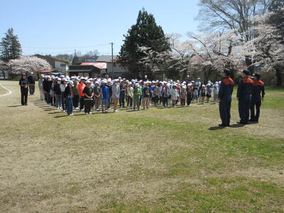 猪苗代消防署磐梯出張所所長さんや磐梯町消防団庶務分団長さんの前で、代表児童が誓いの言葉を述べました。