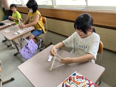 こちらは4年生。割りばしと輪ゴムを使った「立てられるかな」の様子です。