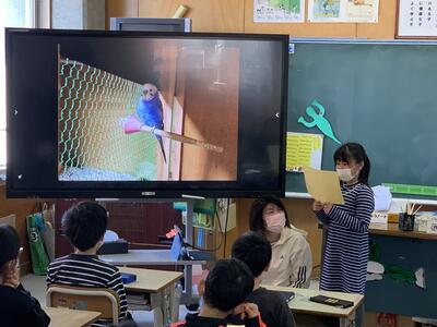 2年生の朝の会で、タブレットで撮影したものを電子黒板に映し、スピーチをしていました