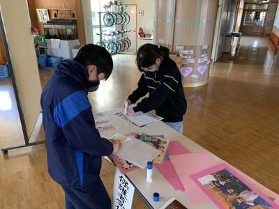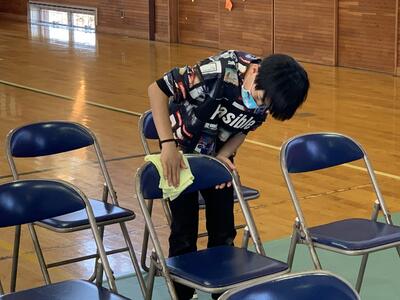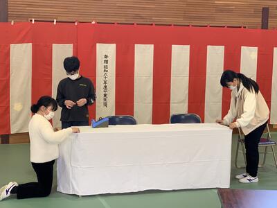 明日の卒業式に向けて、5年生と先生方で会場づくりを行いました