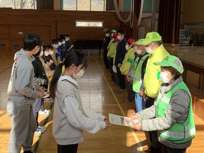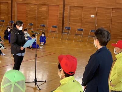 児童代表から見守り隊の皆さんへの感謝の言葉を伝え、その後、メッセージカードをお渡ししました