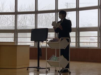 その後、校長先生から、この度日曹金属化学様よりご寄贈いただいた図書館用本の披露がありました