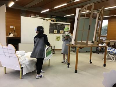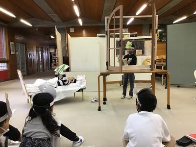 そこに何と、まだ記憶に新しい、4年生が発表会で演じたすばらしいはっぴょうの「がまくんとかえるくん」の劇で使った、舞台セットが登場しました