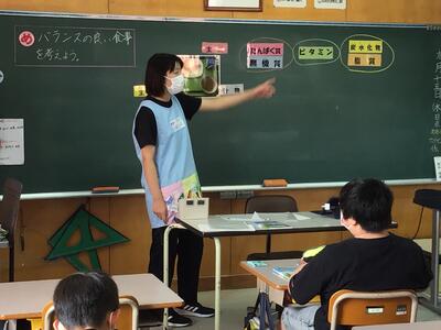 2022年9月15日 15時45分6年生の学級活動で、栄養教諭の先生と担任の先生によるティーム・ティーチングで、「バランスの良い食事」について考えました