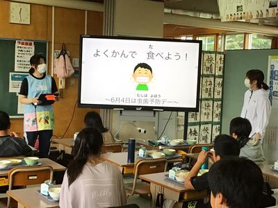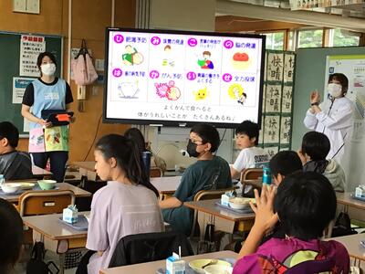 給食の時間に、栄養教諭と養護教諭が正しく「食べること」の大切さについて子どもたちに伝えました
