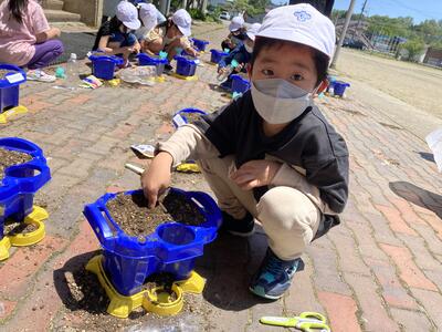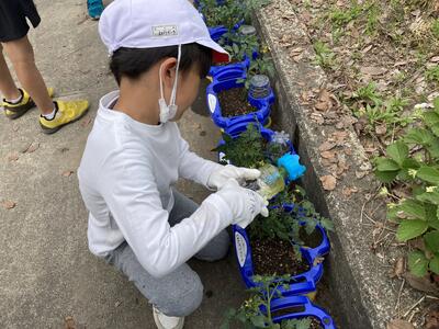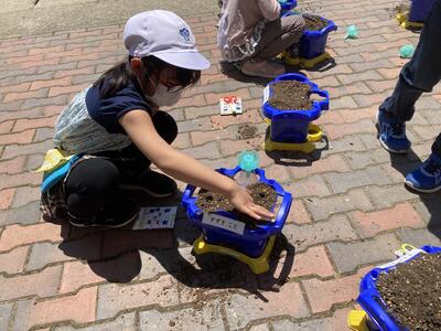 1年生があさがおの種を植え、楽しそうに活動している様子ですどんなきれいな花が咲くか、楽しみですね