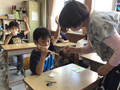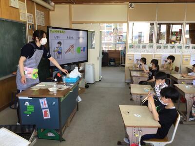 2年生が食育の授業で、「正しいはしのもち方」について学びました