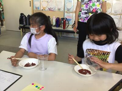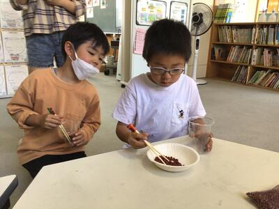 小豆と豆をはさむ練習では、教わったことに気をつけながら一生懸命取り組んでいました